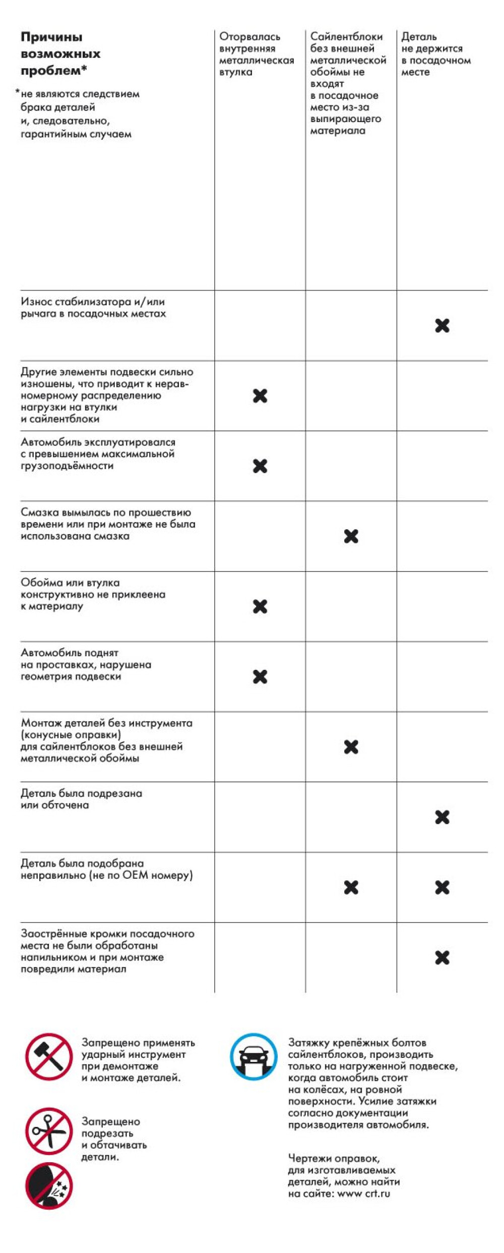 Внимание! Оригинальный сайлентблок имеет наружную металлическую обойму. Подберите оправку и подставку для демонтажа сайлентблока. Внешний диаметр оправки должен быть на 0,5 мм меньше внешнего диаметра наружной металлической обоймы, чтобы не повредить посадочное место. Внутренний диаметр подставки на 1-2 мм больше внешнего диаметра наружной металлической обоймы, чтобы не препятствовать выходу сайлентблока из посадочного места. Чертежи оправок, для изготавливаемых деталей, можно найти на сайте crt.ru.