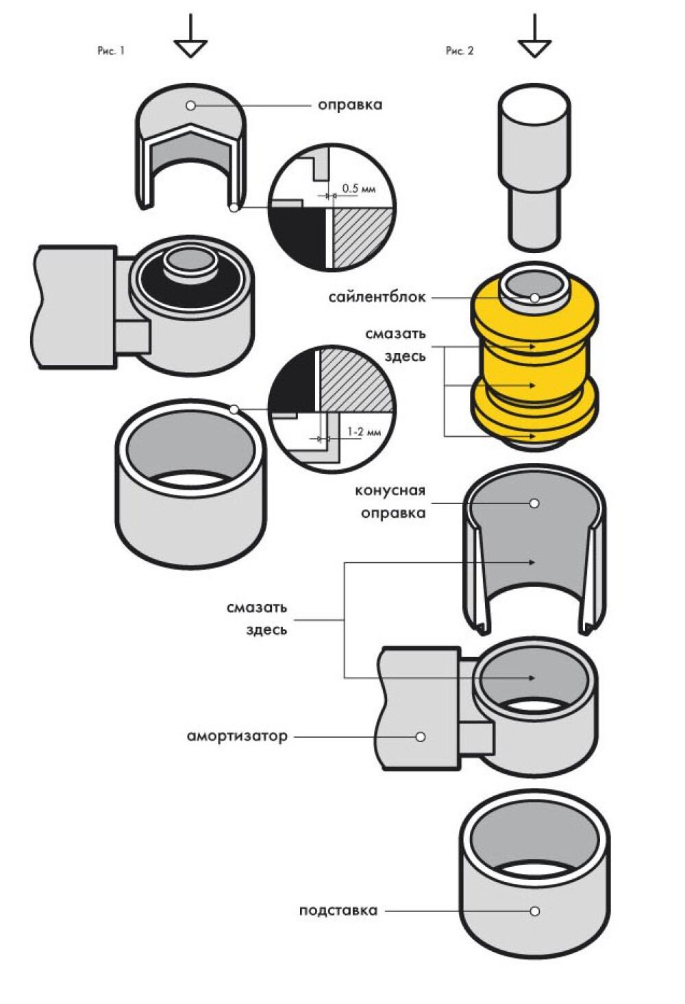 - Установить в конусную оправку сайлентблок (рис.2).
