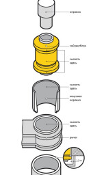 - Первоначально сайлентблок может заходить в посадочное место с небольшим перекосом, это объясняется разницей диаметров оправки, посадочного места и сайлентблока. Больший диаметр сайлентблока, благодаря упругой деформации тела сайлентблока, позволяет заполнить посадочное место и зафиксировать сайлентблок.